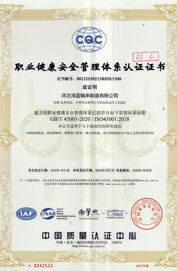 海蓝轴承已通过IS09001: 2008和GB/T 19001-2008质量管理体系认证。生产线全部采用目前国内先进的专用设备,自动化程度达到90%,技术工艺先进,检测手段齐全,质量管理体系完善。公司采用国际标准技术质量标准,以先进的制造工艺和现代化科技管理手段,为广大用户提供高质量产品。